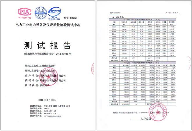 GTG30的能效比經(jīng)中國電力科學(xué)研究院電力工業(yè)電力設(shè)備及儀表質(zhì)量檢驗測試中心測試,“電磁鍋爐能效比為:1.056”。